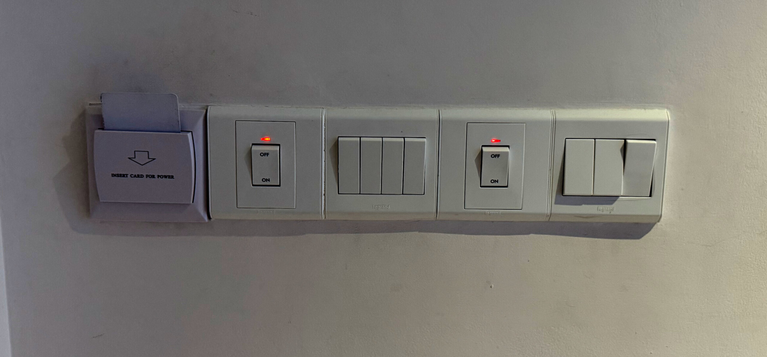 A key card, often times the one to open your door, is inserted into a slot to activate the rooms electricity