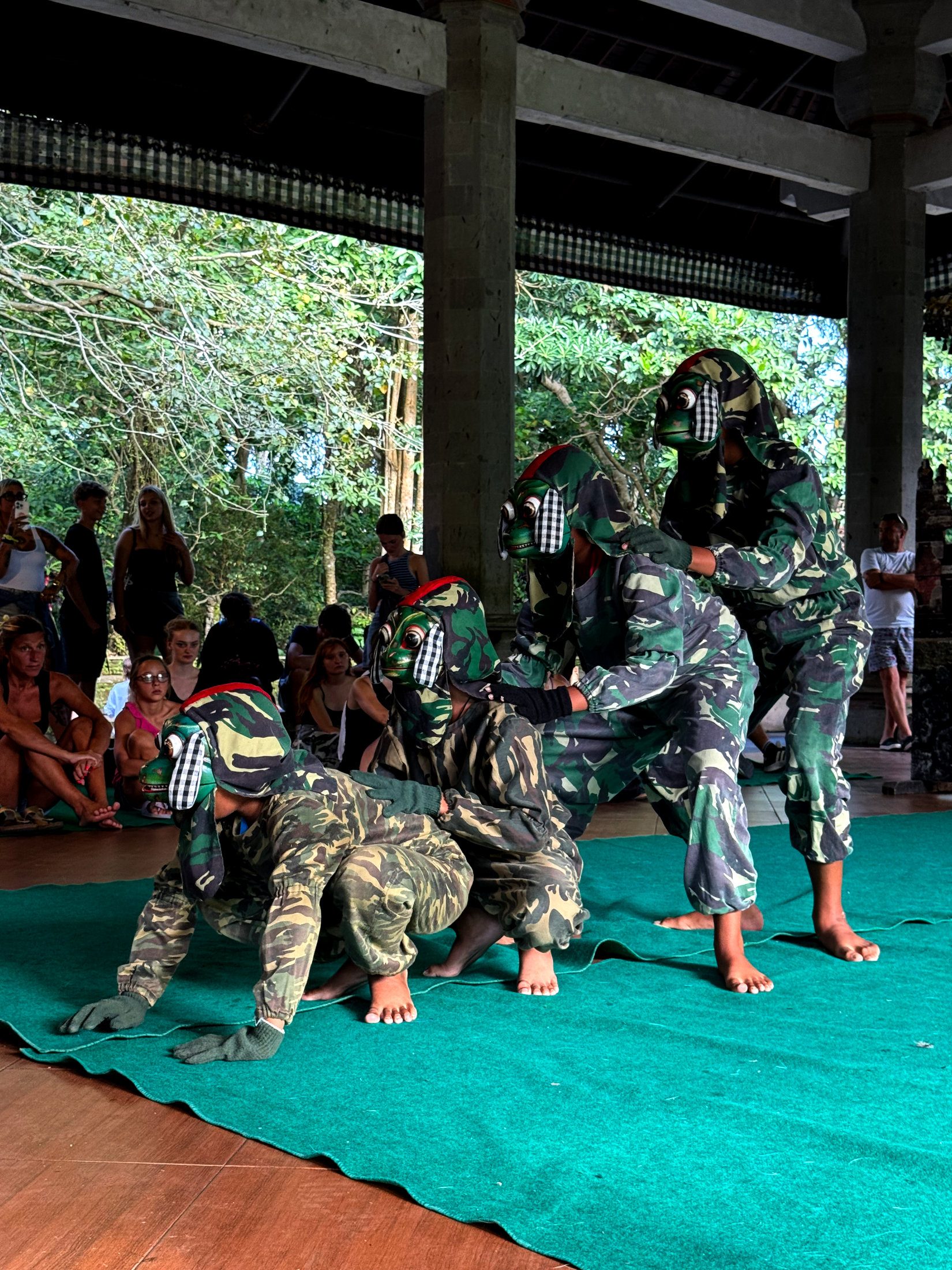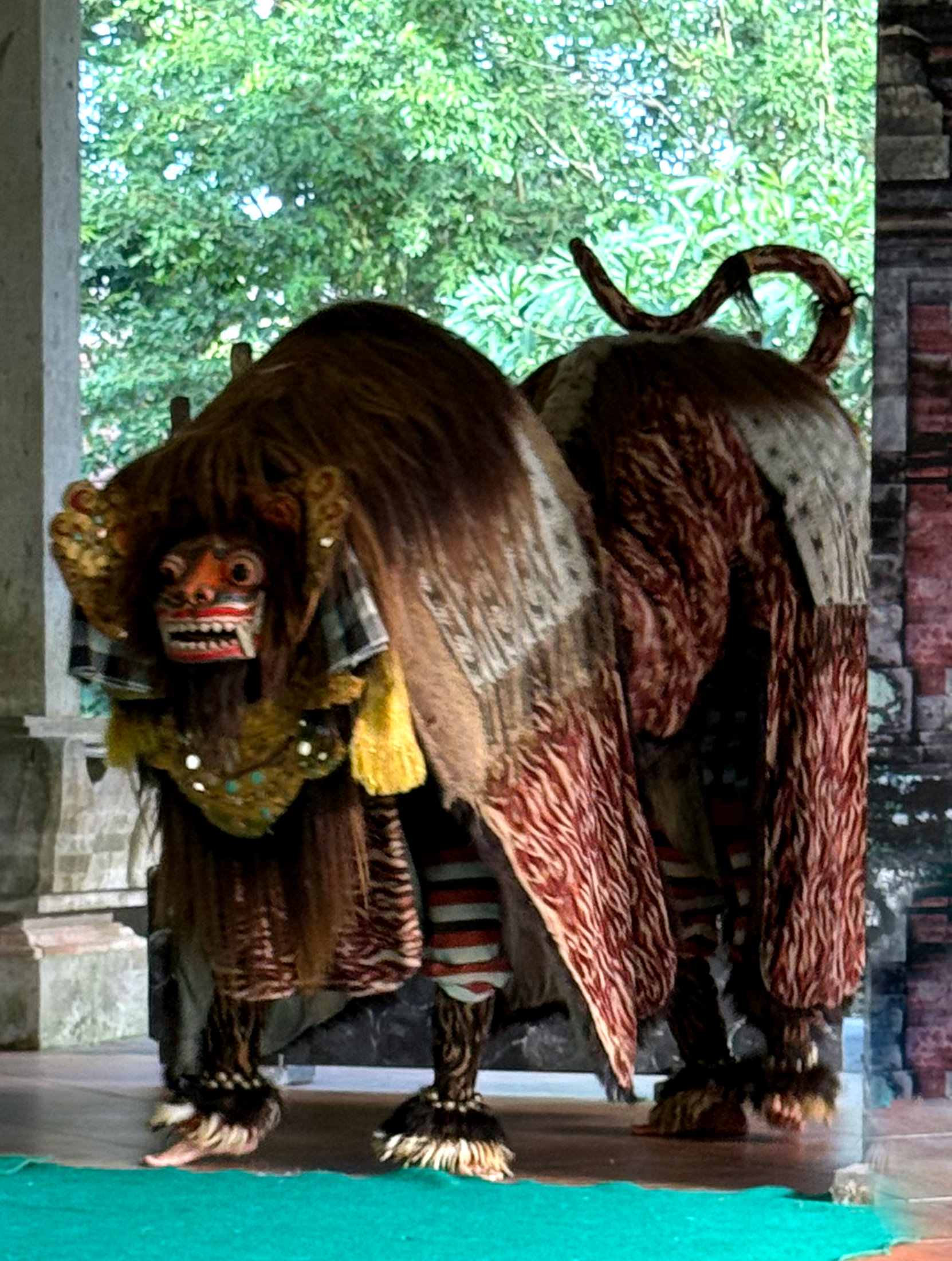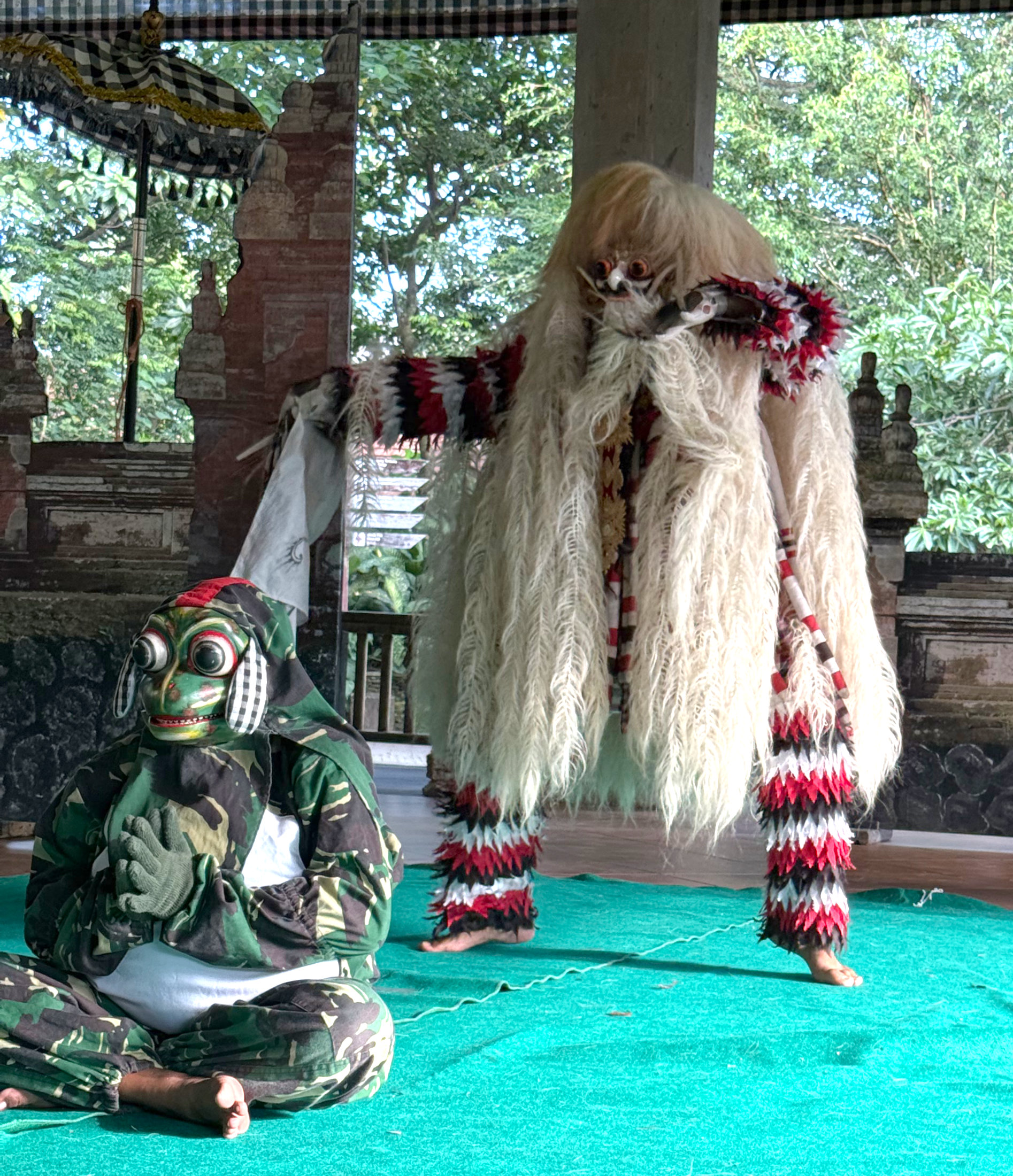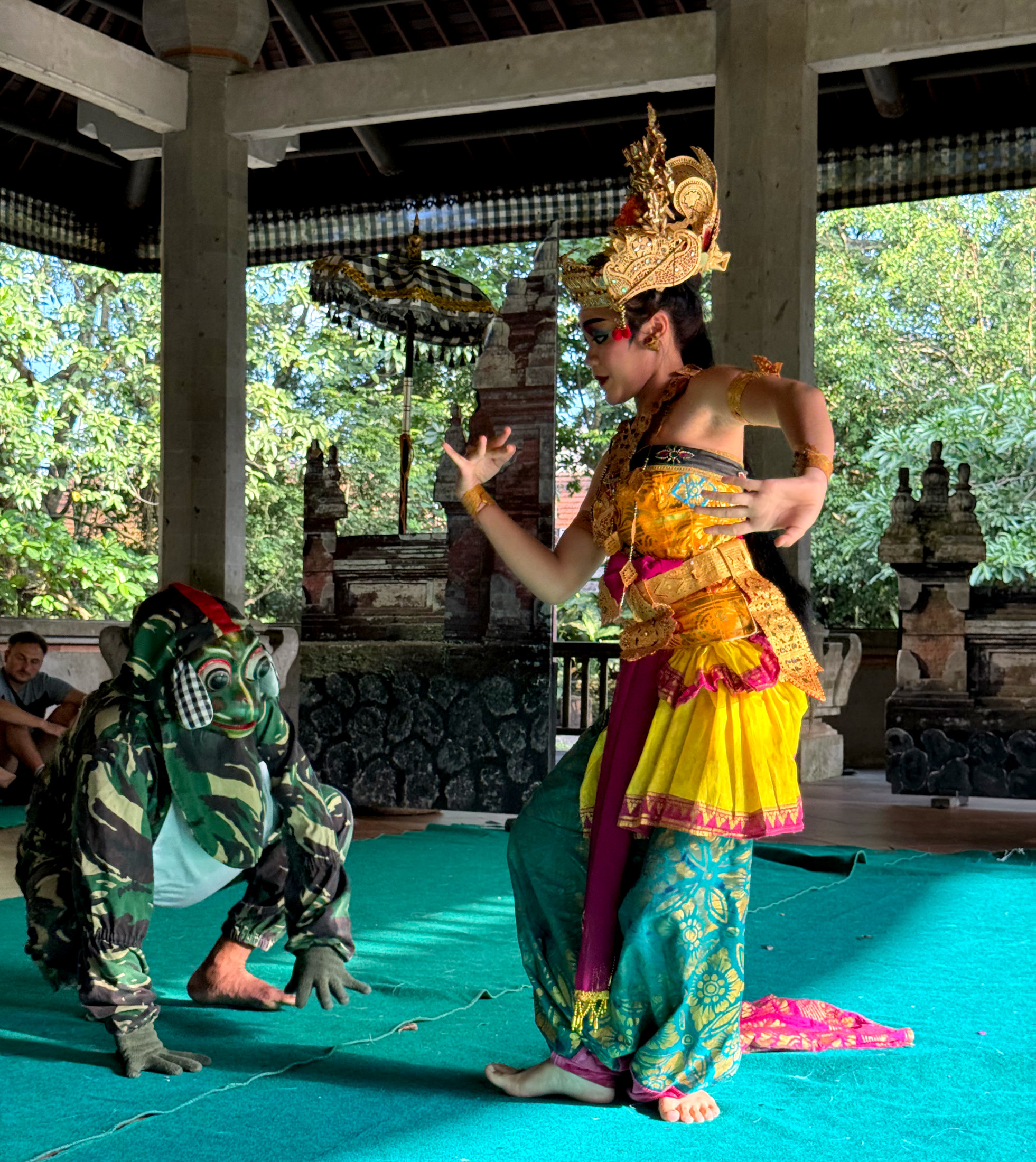 I luck into front-row seats for the Lubdaka Dance, also called Tari Lubadaka. This traditional Balinese dance originated in Petulu village, right here in Ubud. There is a narrator explaining, but honestly, I don’t know what the hell is going on. Something about dragonflies and frogs, a prince and princess, and some scary monster creatures. Could care less — It’s a kick in the pants. The musicians make the story come alive: frog percussion, dragonfly flutes, pounding rhythms for the monsters. The whole thing is quite the treat. One of those happy accidents I just happened to stumble upon. Love when that happens.