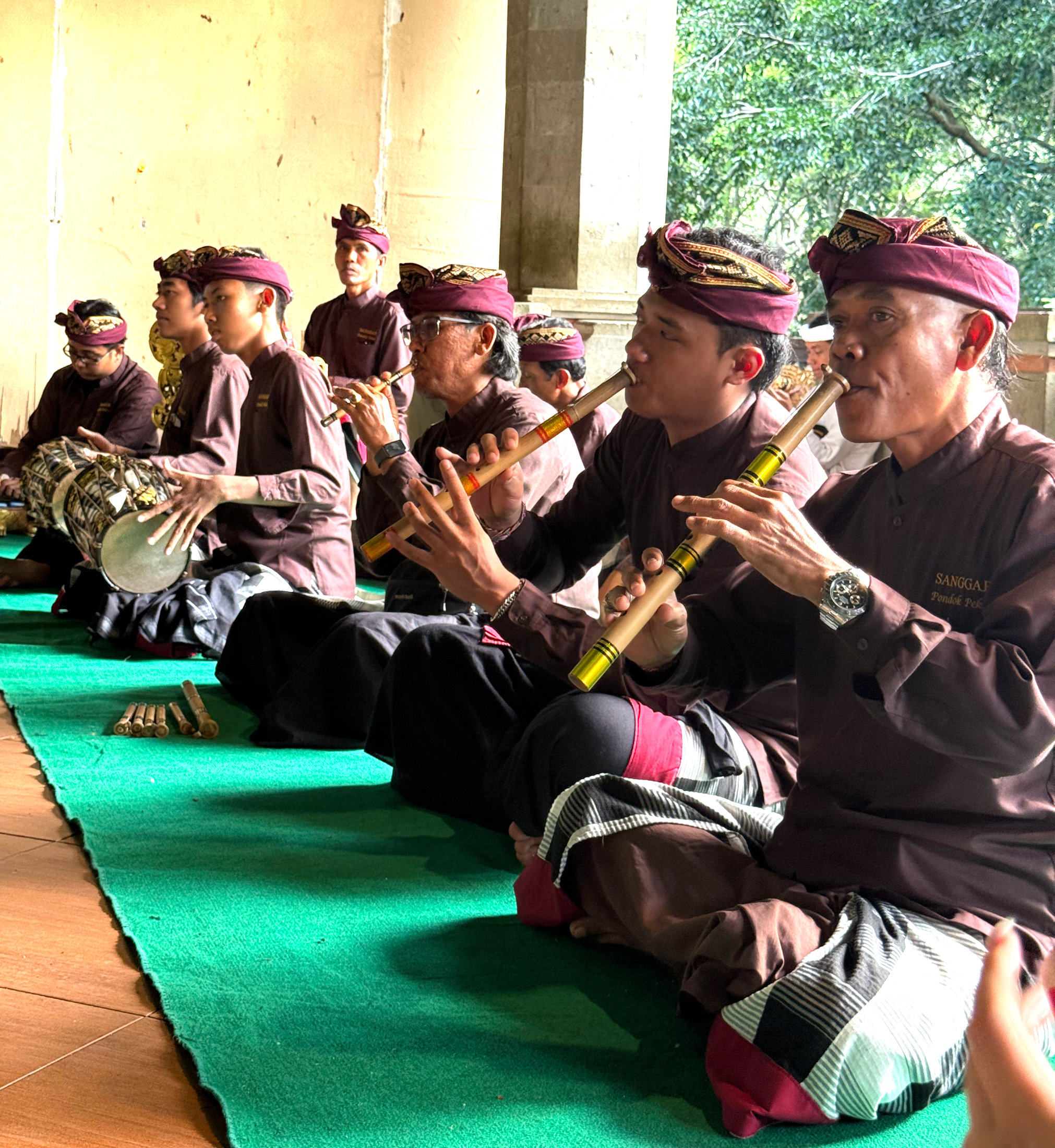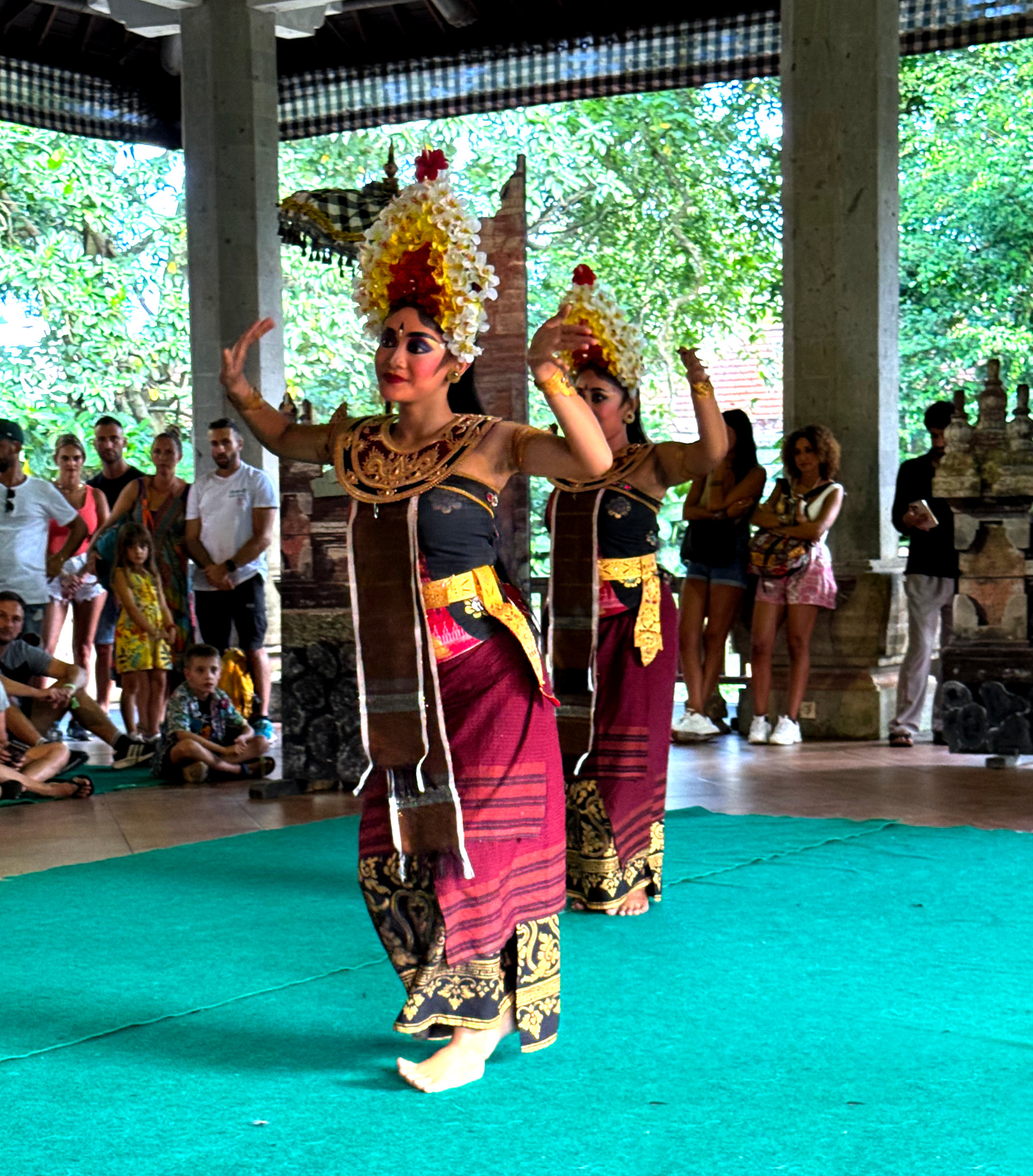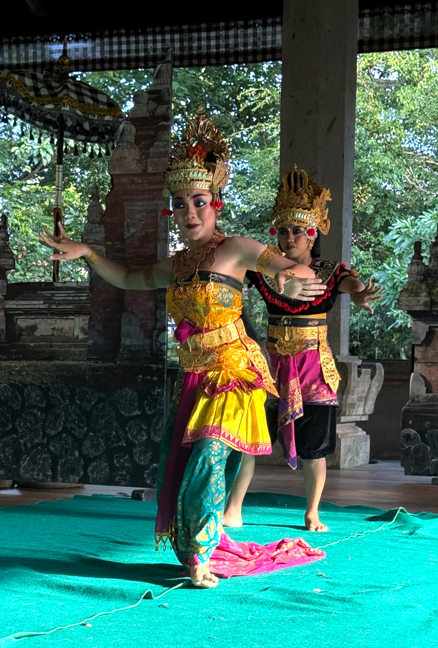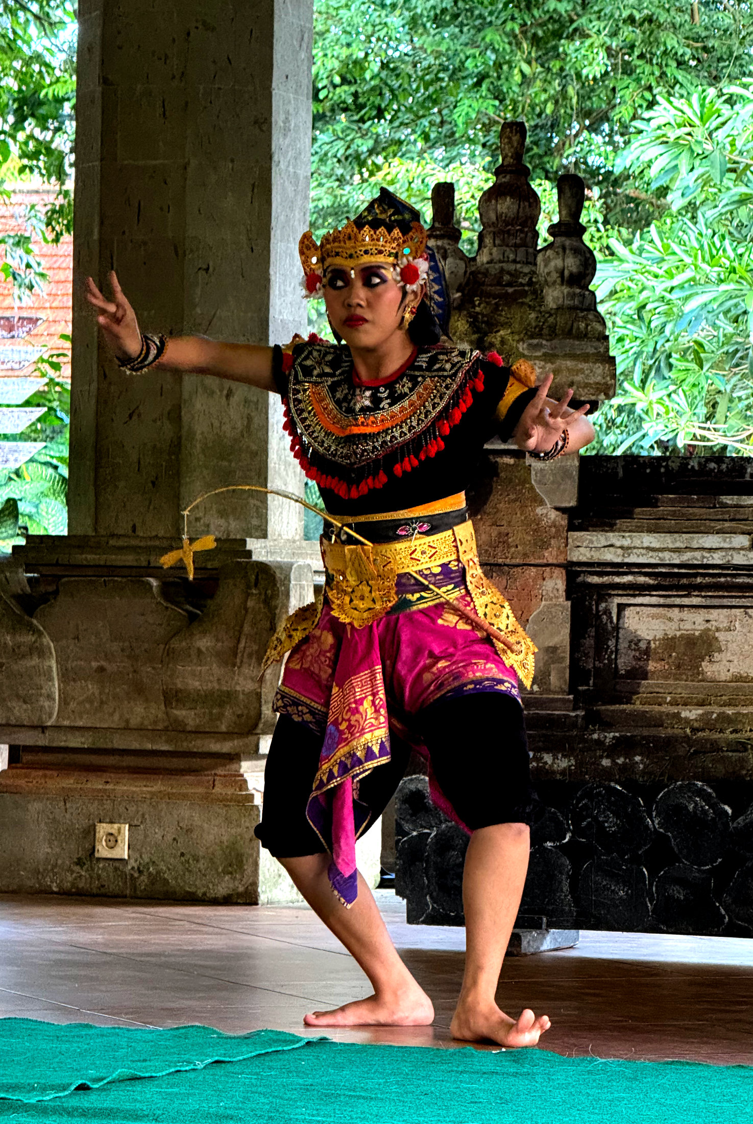 I luck into front-row seats for the Lubdaka Dance, also called Tari Lubadaka. This traditional Balinese dance originated in Petulu village, right here in Ubud. There is a narrator explaining, but honestly, I don’t know what the hell is going on. Something about dragonflies and frogs, a prince and princess, and some scary monster creatures. Could care less — It’s a kick in the pants. The musicians make the story come alive: frog percussion, dragonfly flutes, pounding rhythms for the monsters. The whole thing is quite the treat. One of those happy accidents I just happened to stumble upon. Love when that happens.