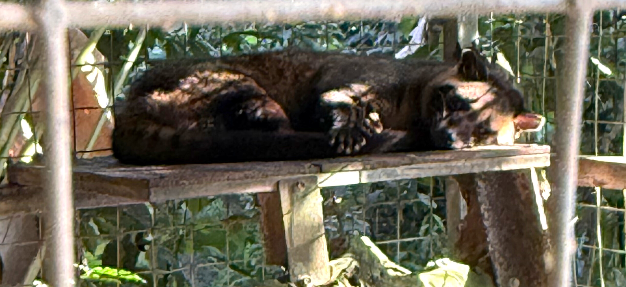 Our plantation guide points out bowls showing all that’s required to make this poop java. Right next to the display of ingredients sits a well-seasoned elderly woman who looks as if she’s spent her entire life roasting these beans. And then, next to her, a caged civet — improperly labeled “Luwak.” I didn’t ask why, since I’d never even heard of a civet. I did, however, ask if the old woman was also kept in a cage after closing. They assured me she went home after her shift — on the ancient rusting bicycle they had on display, I assume.